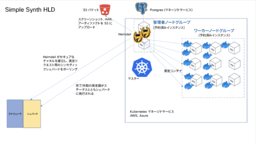 Simple Synth アーキテクチャには、さまざまなクラウドプロバイダーやロケーションに展開された複数の Kubernetes(K8s)ベースクラスタが含まれています。各クラスタは、シンセティックチームが開発した「Heimdall」と呼ばれるローカルコンポーネントで構成されており、クラウドベースのリモートサーバコンポーネントと通信します。