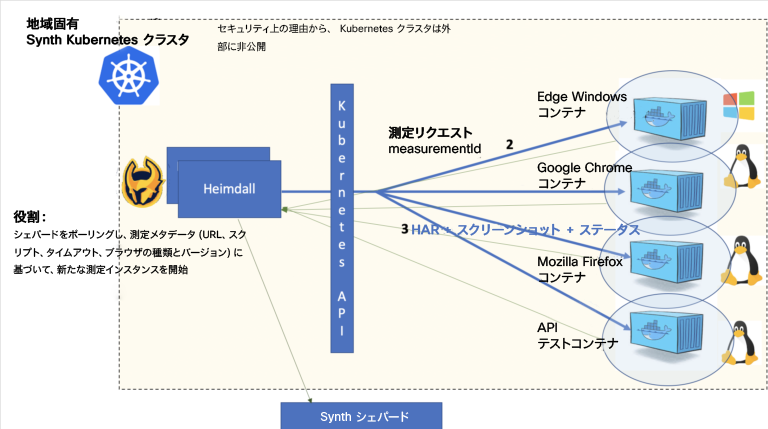 をベースとして構築されています。そのため、導入に必要なフットプリントは小さくて済むにもかかわらず、拡張性に優れ、大量の処理が可能です。Heimdall は Kubernetes と通信し、ジョブ固有の情報を送信・取得し、測定コンテナのライフサイクル全体を管理します。