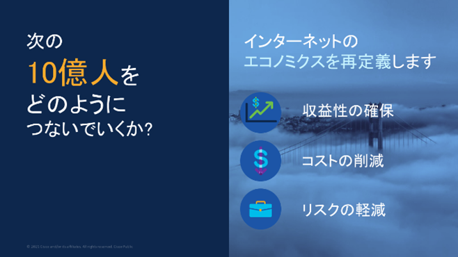 このインターネットのエコノミクスを再定義しなければ、次の 10億人をつなぐことができません。この再定義を可能にするためにシスコが考える 5G 時代のネットワークアーキテクチャについてお話したいと思います。
