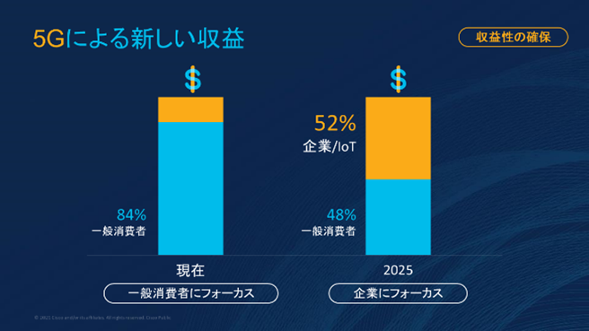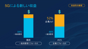 サービスプロバイダーの収益は、これまでの 4G では一般消費者からの売上が 84%を占めていたのに対し、5G時代には企業および IoT における売り上げが 52%を占めると予想されています。