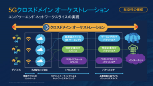 つまり、5G では目的と用途、サービス品質への期待値が異なるトラフィックが混在します。RAN・エッジデータセンターからトランスポート、パケットコアまでを SLA や目的に応じたエンドツーエンドのネットワークスライスをまず行い、さらに、サービスや区間での運用分割損やマニュアルでのハンドオーバを極力排除した「クロスドメイン オーケストレーション」の実現が必須となります。これにより、サービスの追加や変更があっても即時性を担保しつつ、OPEX がそれに比例して上昇するのを抑えることができます。