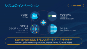 シスコはイノベーション、アーキテクチャ変革により大幅なコスト削減、TCO の最適化を進めることが可能であると考え、シリコン、オプティクス、ソフトウェア、システムの 4つの領域で技術革新に投資を行い、それらを総称して「Converged SDN トランスポートアーキテクチャ」として推進しています。