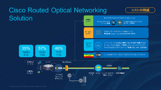 ここでもっとも重要な要素となるのは、ルーデッド オプティカル ネットワーキングです。これまでルータは IP トラフィックのルーティング、それらを飛ばすのはオプティカルトランスポートと役割が分かれており、レイヤごとの設計、導入、運用管理が必要でした。この課題を「デジタルコヒーレントオプティックス」技術により解消し、その技術をルータに取り込むことによってシンプルな構成を可能にするのがルーデッド オプティカル ネットワーキングです。セグメントルーティングにより、ルータが処理するトラフィックをすべて束ねて全体をオーケストレーションします。