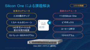電力コストは 100G 1ポートあたり年間の家庭の冷暖房費からコーヒー 2杯分へ。輸送コストは 900キロ・10パレットから 15キロのダンボール箱一つへ。これは単なる電力、輸送コスト削減だけではなく、環境問題、低炭素型社会モデルへの対応についても Silicon One の技術革新が貢献することを意味しています。