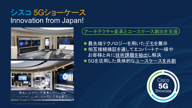 ただし、いままでにないユースケースを実現するには、多くのイノベーションと最適化が必要です。パートナー様、メーカー様とみんなで社会を変えていきたい、そんな5Gの未来を実現するためシスコは 2020年11月、東京オフィスに「5G ショーケース」を設立しました。シスコはこの5Gショーケースにより収益性の確保、コストの削減、リスクの軽減を実現する最適なアーキテクチャを提言し、日本のデジタル化に貢献していきたいと考えています。