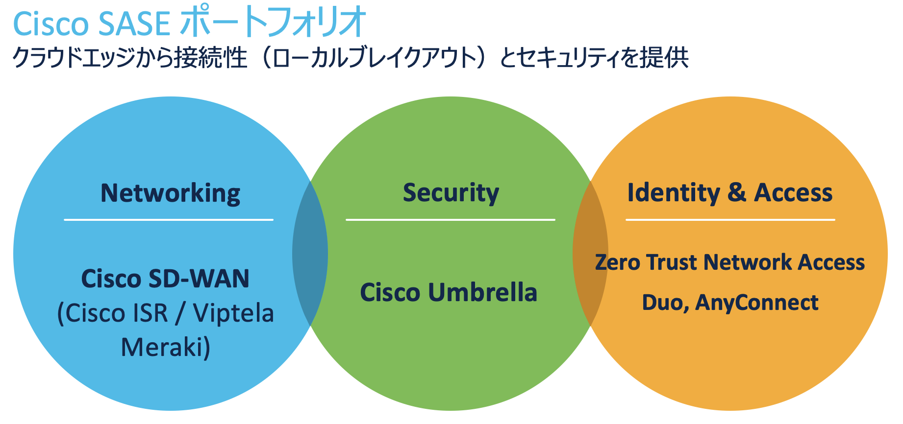 Cisco は Gartner やその他の SASE レポートで重視される、クラウドエッジネットワーキング、クラウドセキュリティ、ゼロトラストソリューションを軸にフルスタックのSASEの実現に向け取り組んでいます。