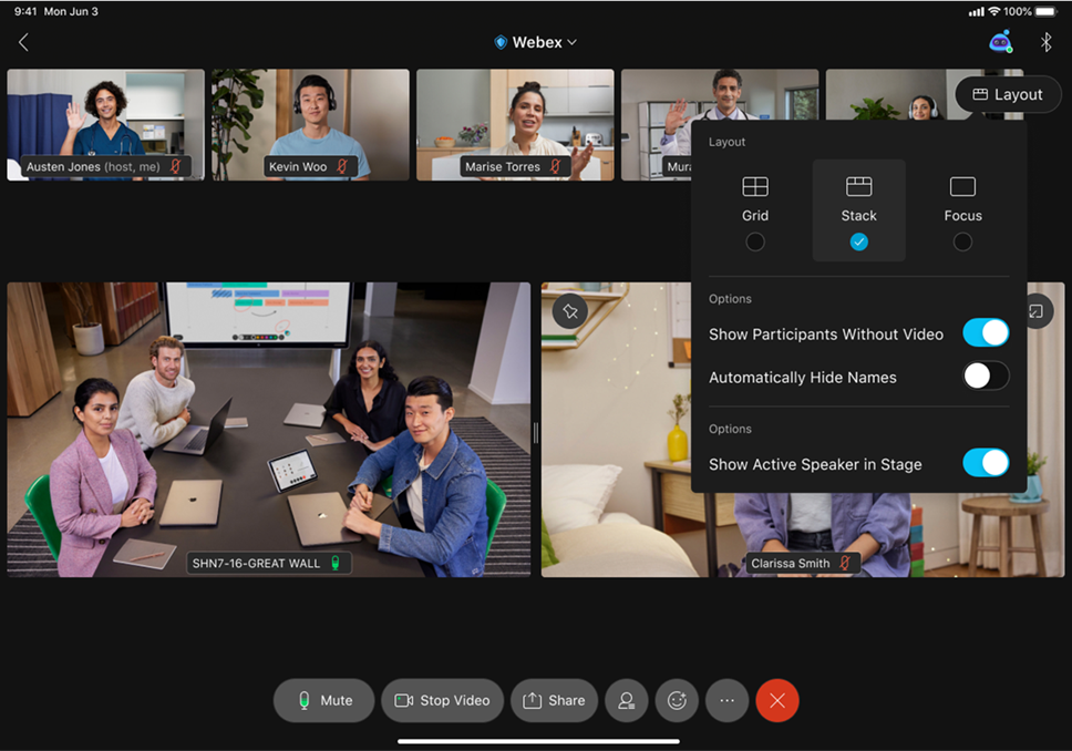 会議のカスタムレイアウトが拡張され、主催者と共同主催者が会議のレイアウトを整理できるようになりました。参加者をメインステージにドラッグアンドドロップし、すべての会議参加者のビューを同期できます。会議のカスタムレイアウトを主催者が制御することで、会議を開始する時点から重要な発言者とコンテンツを中心とした魅力的なビューを表示できます。