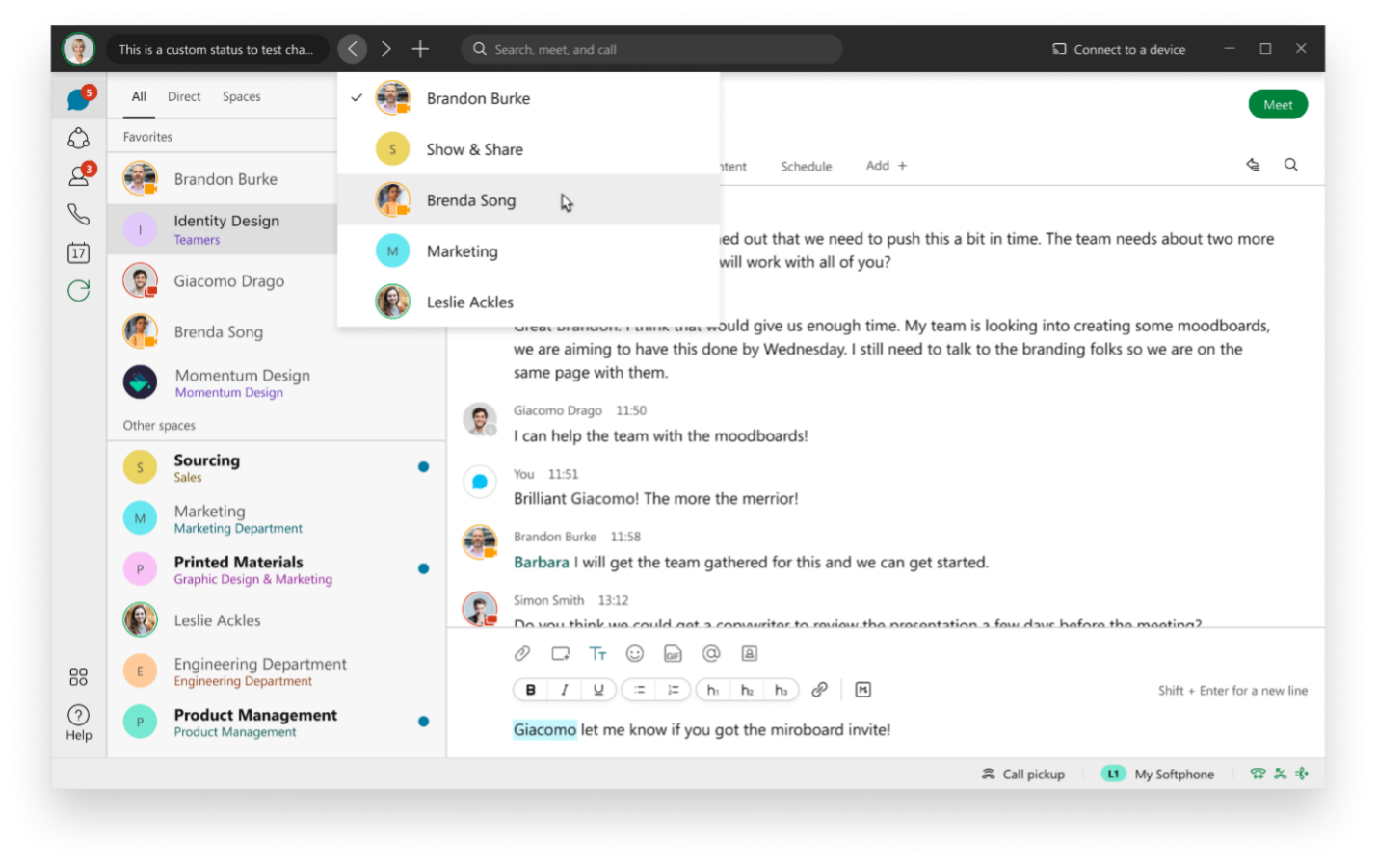 最近アクセスしたスペース間を簡単に移動できるようになりました。記憶をたどってスペースを探す必要はありません。アクセス履歴をたどりながら、最後にアクセスしたスペースを見つけて、仕事や会話をスムーズに続行できます。矢印を使ってスペース間を前後に移動することも、矢印を押したままにして履歴のリストを表示することも可能です。