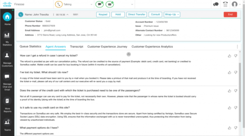 • Agent Answers は、エージェントと発信者のやり取りに基づいて AI を活用した提案や推奨事項をリアルタイムで提供します。この機能を使えば、エージェントは迅速に回答できるようになります。組み込みのガジェットが通話内容を聞き取り、回答案やナレッジベースの記事をプロアクティブに提供します。回答の検索に費やす時間が減り、優れたカスタマーサービスを提供するためにエージェントがより多くの時間を割くことができるようになります。