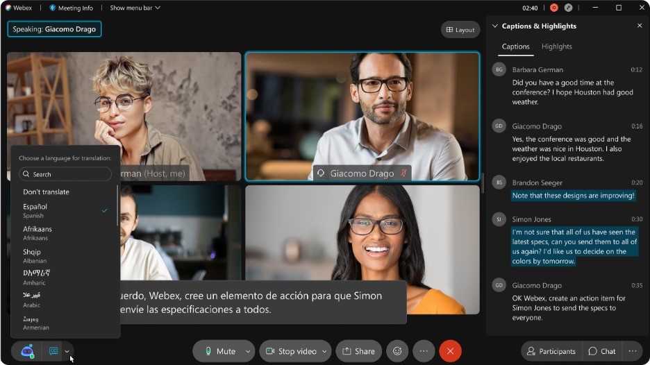 Webex Assistant は、リアルタイムの翻訳機能も提供します。会議の参加者は、追加でサポートされている 100 以上の言語のどれかを選び、英語からの翻訳を字幕表示できます。言語を選択すると、会議中の発言がリアルタイムで翻訳されます。リアルタイム翻訳は、発言の理解を促すとともに、インクルージョンを今まで以上に意識した会議を実現します。実りあるコラボレーションが言葉の壁に阻まれることは、もはやありません。