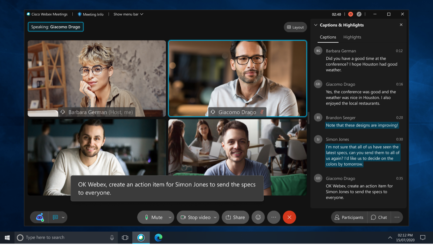 会議で Webex Assistant を使えば、メモを取る、フォローアップするなど、よくある会議関連作業を音声で処理することもできます。使い方は簡単です。「OK、Webex。そこをハイライト表示して」、「メモして」などと言うだけで、自動のアクションがトリガーされます。キーボード操作が不要なので、体の不自由な人には特に便利です。