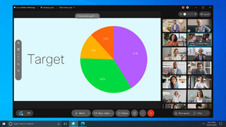 Webex には、ズームイン/ズームアウト機能があり、グリッドビューを 5 X 5 から 2 X 2 までの間で調整できます。右上隅の簡易なスライダーを使用すると、ズームインして画像を拡大表示したり、限界までズームアウトしてできるだけ多くの人を表示したりできます。