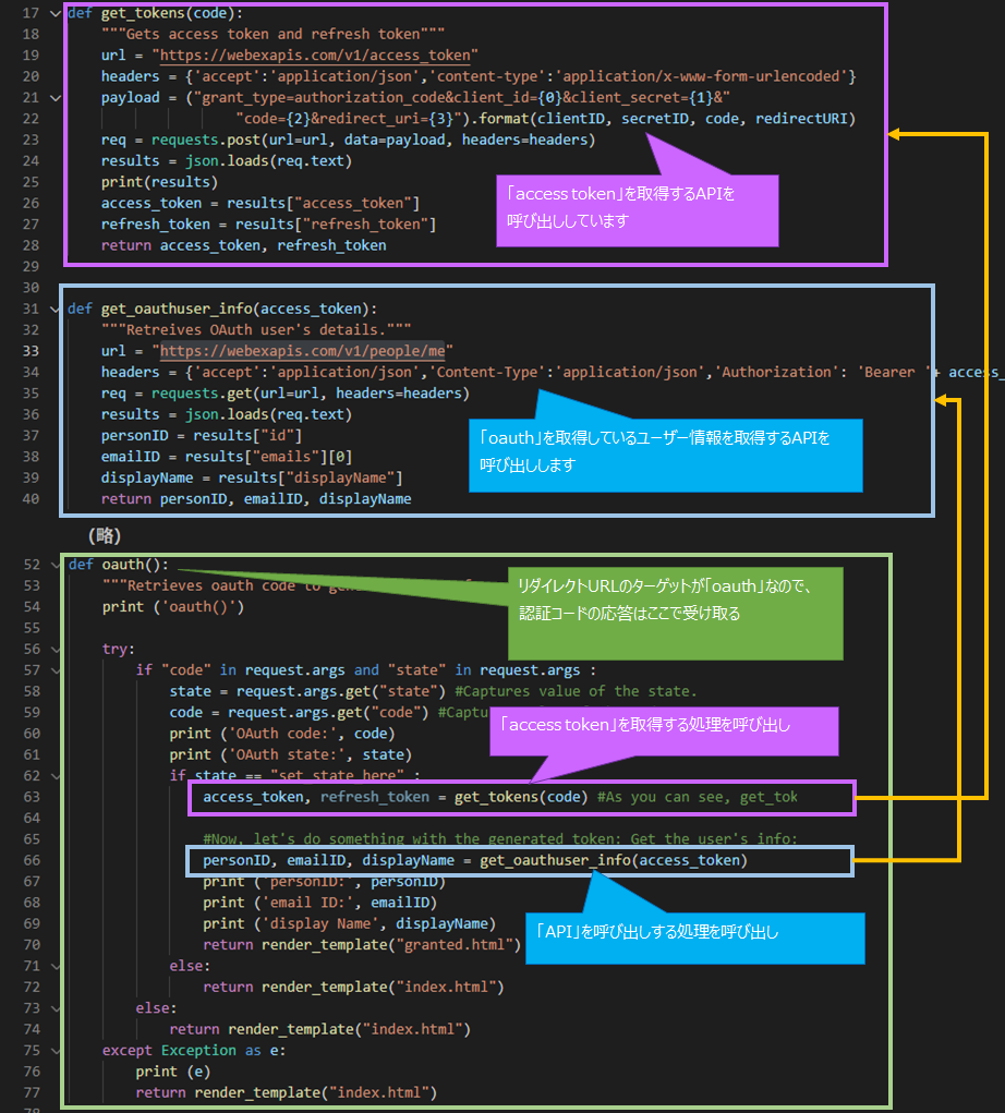 第4回で使用したサンプルプログラムを参考に、Webex Meetings のスケジュール作成用の OAuth認証コード、アクセストークンを取得し、API を使用する流れを作成します。