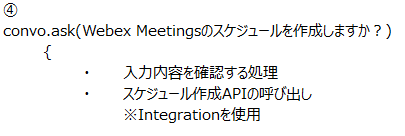 作成した bot プログラムの「工程④」にて、スケジュールを作成する返答が bot にあった場合、「2. Webex Meetings を作成する API を呼び出しできるようにする」工程で作成したフローに進むよう呼び出し処理を追加します。