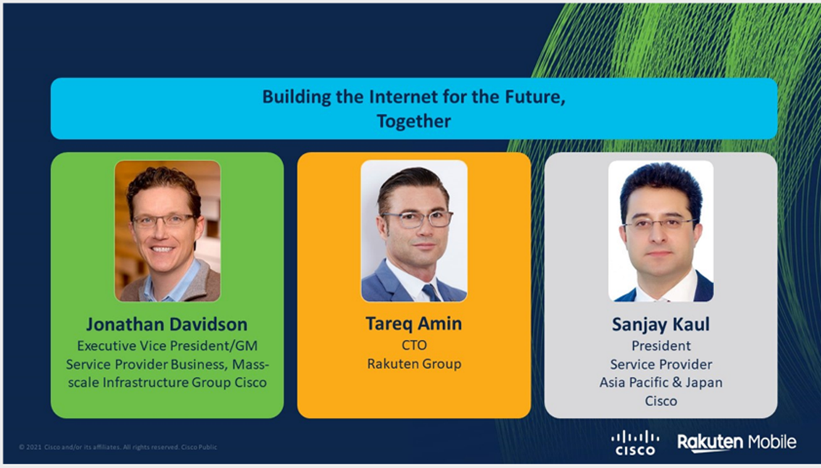 一人目は楽天グループ CTO、楽天モバイル株式会社 代表取締役副社長兼 CTO の Tareq Amin 氏。そしてもう一人は、シスコ マススケール インフラストラクチャ担当エグゼクティブ バイスプレジデントを務める Jonathan Davidson です。