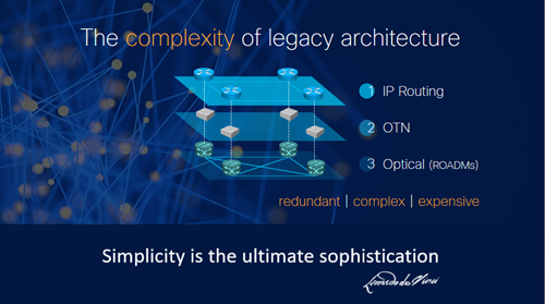 そして「そのためにはインフラの構築と運用にかかるコストを下げる必要があり、新たなテクノロジーが求められる」として、「複雑化してサービスプロバイダーごとに分断、サイロ化したレガシーアーキテクチャをシンプルに、自動化しやすいものにする。IP ルーティングと OTN、オプティカルの 3 つの階層をシンプルに統合できれば、設備投資だけで約 35%、オペレーションコストも含めると 50% もの削減が可能です」と説明しました。