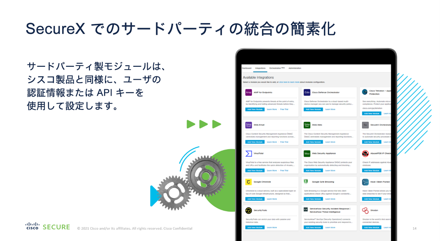 昨年の夏、リモートリレーモジュールを導入し、ユーザが任意のデータソースを利用できるようにしたのも同じ理由です。この設計により、SecureX ユーザは「独自のモジュールを導入」して自社環境にコードを展開することで、調査のリソースとしてあらゆるものを利用できるようになります。