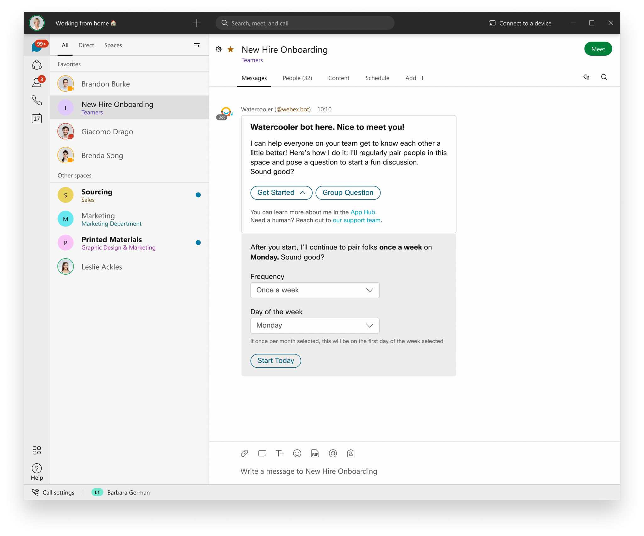 Watercooler ボットは、チームが絆を深めたり打ち解けたりするのに最適なツールです。ボットを Webex の任意のグループスペースに追加しておけば、自動的に毎日、毎週、または毎月、ボットが新しくチームメイト同士をペアリングし、チーム内の会話が続くようにします。詳細はこちら