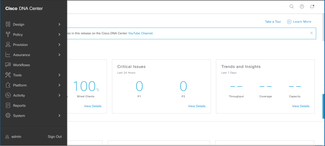 Cisco DNA Center のメニュー構造がより直感的になり、すっきりとしたインターフェイスになりました。ユーザナビゲーションを改善したことで、これまでよりも直感的に操作できるようになっています。ダッシュボードには「ハンバーガーメニュー」があり、このメニューを開くとトップレベルの選択肢がすべて表示されます。各メニューにマウスを合わせると詳細なオプションが表示され、画面間を簡単に移動できます。インターフェイスがすっきりとしているため、ラップトップからでもネットワークを簡単に管理できます。オフサイトの IT チームにとって便利なインターフェイスです。