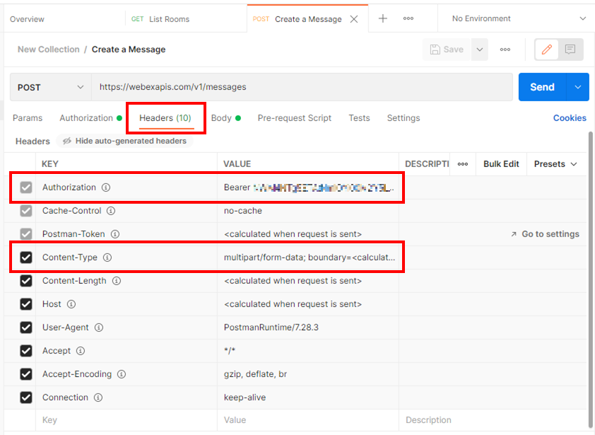 Postman に「HTTP動詞」の「POST」と、「URI」「https://webexapis.com/v1/messages」を設定します。