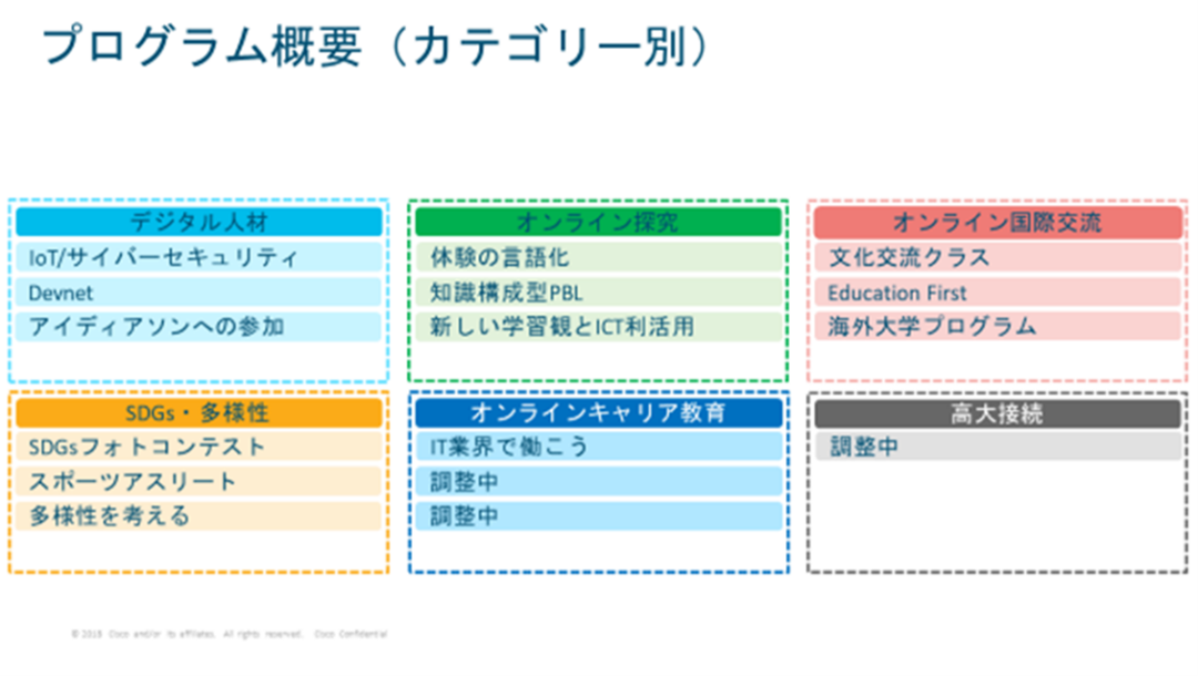 ここ1,2年で急激にオンライン教育の需要が高まりましたが、教育に携わる方の中には、まだまだデジタルツールを使用しての学びに慣れない、という方もいらっしゃるのではないでしょうか。デジタル スクール ネットワークは、参加者のニーズに合わせ、シスコ側で様々なテーマの授業を用意します。オンライン教育の第一歩を踏み出したい方にも簡単にご活用頂けるようなプログラムです。