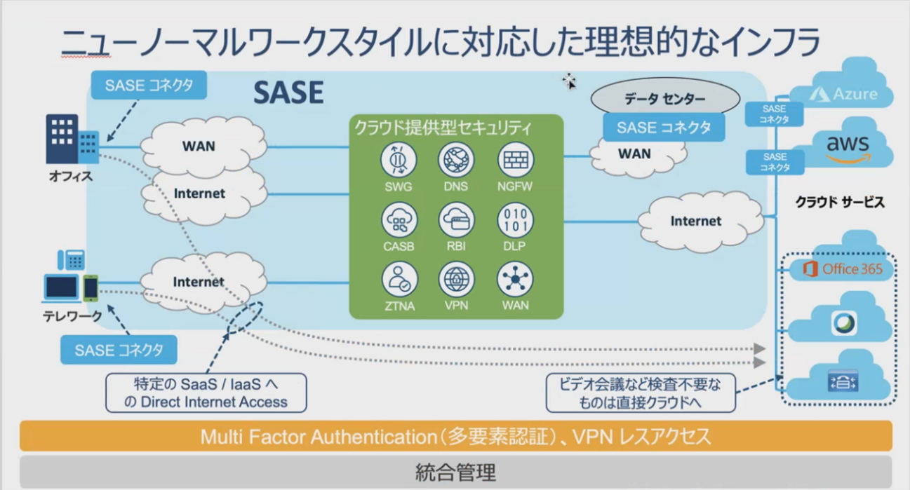 そこで重要となってくるのが「SASE」ですが、SASE の考え方やイメージをつかむために頭に置いておくべきなのは、現在のビジネスにとって「ネットワーク」が不可欠であり、ネットワークについて考える際には、同時に「セキュリティ」についても考慮する必要があるということ。かつ、前述の変化によって旧来のような「社内と社外」というネットワークの区分は意味が薄れており、現在の状況に対応できる新しい考え方が求められているという点です。