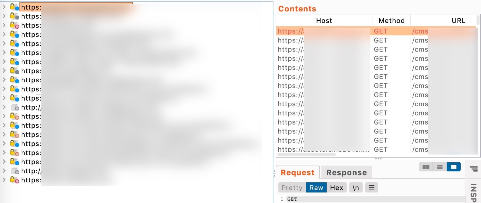 Burp の [Targets] タブ。CTRT が知りたいホストが表示されている