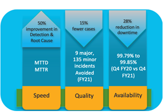 このプロセス下のケース対応スピードは平均 30 分も掛かります。しかも事前にアプリの健全状況を把握できないせいで、お客様がケースを上げるまでに既に時間を掛けて自分で四苦八苦調べたかもしれませんので、IT 体験は非常に悪いものであります。シスコ社内のフルスタックオブザーバビリティに AppDynamics を利用された後は、殆どの場合はテクニックサポートセンターがエンドユーザーよりも先に問題を気づき、それの対応に取り掛かります。仮にユーザーからケースが上がったとしても、一から調査するというよりも、既に把握している状況をユーザーに伝え、最善な対応方法を行うのみであります。AppDynamics をフルスタックオブザーバビリティ取り入れてからは、SCM アプリ関連の問題特定は 50% 早くなりました、ケース自体も 15% 減り、アプリの稼働率も 99.79% から 99.85% へ上がりました。