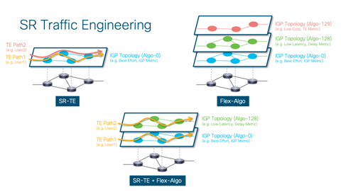 IGP メトリック/TE メトリック/遅延といった値に基づき、動的に最適なスライスを選択できる SR-TE/FleAlgo 機能をご紹介します。