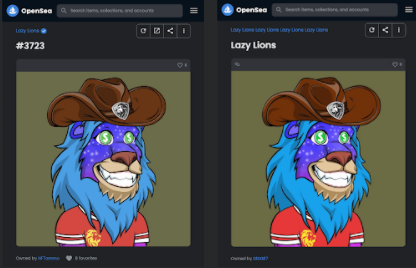 実のところ、NFT に一般に考えられているほどの「非代替性」はありません。NFT が作成されると、消去不可能な形でブロックチェーンに配置されることは事実ですが、アートワークを取得して別のブロックチェーン上にミントしたり、完全に同一のブロックチェーン上で別のスマートコントラクトを介してミントしたりすることを妨げる水組みは皆無なのです。下の図は、Ethereum ブロックチェーンでミントされ、現在ほぼ 2 ETH の価値がある実際の「Lazy Lions」プロジェクトからの NFT です。