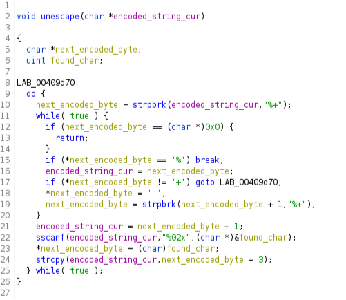 この unescape 関数は、URL エンコードされたバイトを元の形式に戻していますが、気になる点があります。処理を実行する際にサイズチェックを行っておらず、「%」の後に必ず 2 つのバイトがあると想定しています。では、「%」の後に文字が 1 つしかなかったらどうなるでしょうか?strcpy の s+3 によって文字列の終端を超えて境界外にアクセスしてしまうので、メモリが破損する危険性があります。