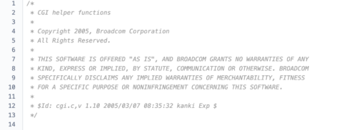 次に、調査中のルータでこのバグをエクスプロイトしようとしてみましたが、そのデバイスでの URL 文字列の扱い方では、エクスプロイトするのは不可能でした。しかし、このコードを使用する他の Web サーバーをクラッシュさせられる可能性はあります。この関数は freshtomato ライブラリに含まれています。そこでソースコードを調べてみたところ、この関数が含まれているファイルの先頭に次のようなコメントがありました。