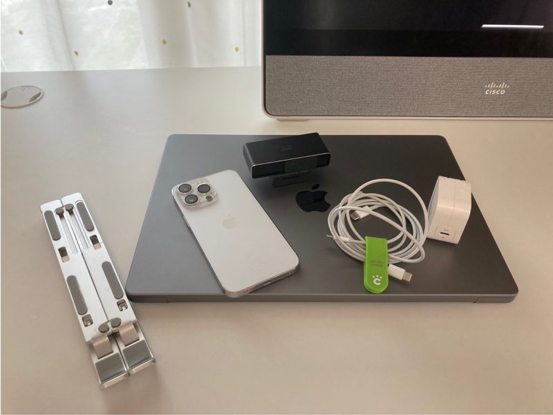 仕事で外出する際、つまりPCを持ち歩く際は常にこのデスクカメラをセットで持ち歩いている。通常のPCセットに加えてこの小さなデスクカメラをツールセットに加えるだけだ。小さくてかさばらず、重量も軽いので負担はない。Desk CameraとPC接続に必要なUSB-C – USB-Cケーブルは電源ケーブルとしても利用できるため、PCを持ち歩く際は常に持ち歩く携帯品。だから、特別なものはいらない。本当にカメラ単体だけを追加すればいい。