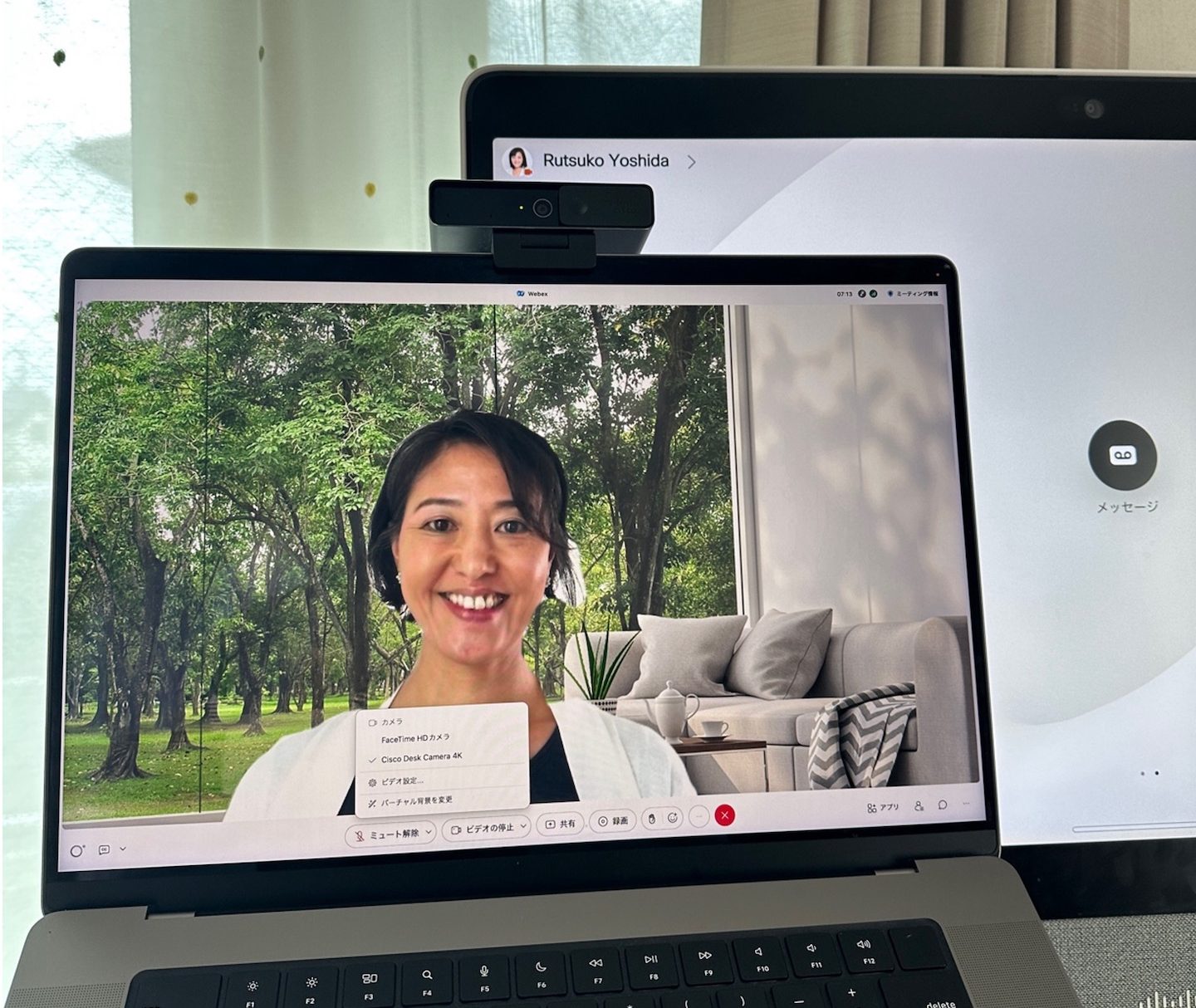 わが家にはCisco Desk Pro があるのでテレビに繋ぐことはないが、もし自宅に専用ビデオデバイスがないのであれば、自宅テレビにPCを接続し、Desk Cameraをテレビの上に設置して大画面でWeb会議に参加することもできる。