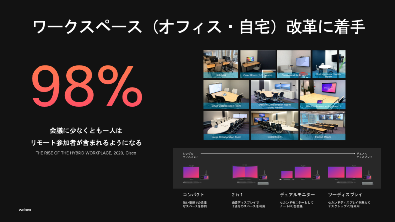 コロナを経て現在は98%の会議が『少なくとも一人がリモート参加者が含まれる会議』だ。これほどまでにWeb会議の必要性が高まったにも関わらず、未だ6.4%の会議室または教室にしか『ビデオ会議環境が整っていない』というデータがある。