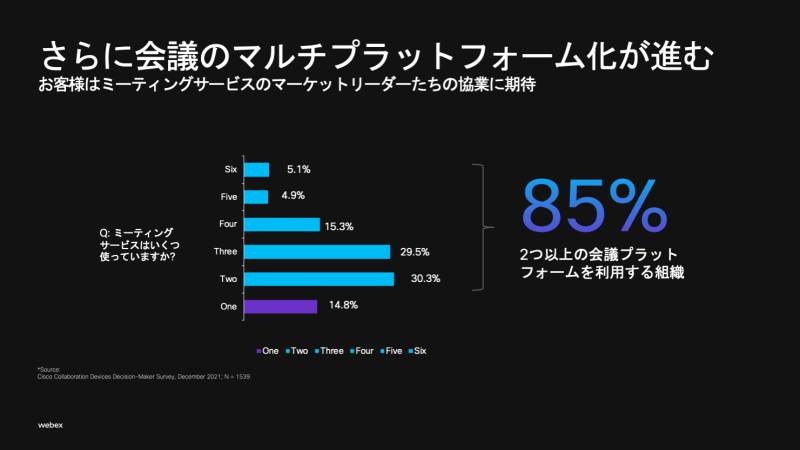 私は職業柄、仕事関係のオンラインミーテイングは、ほぼ9割がWebexだが、一般的には85%の人が『日常的に2つ以上の会議プラットフォームを利用している』という結果がある。