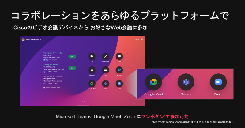補足になるが、Cisco devices(Desk シリーズ・Boardシリーズ・Roomシリーズ)であれば、Google Meet, Zoom, Microsoft Teamsなどとの連携にも投資をし、オーディーとカレンダーの連携が可能になっている。そのためワンボタンで各会議ツールへ参加することができる。A会議室でもB会議室でもどちらも会議プラットフォームによらず予約できる。