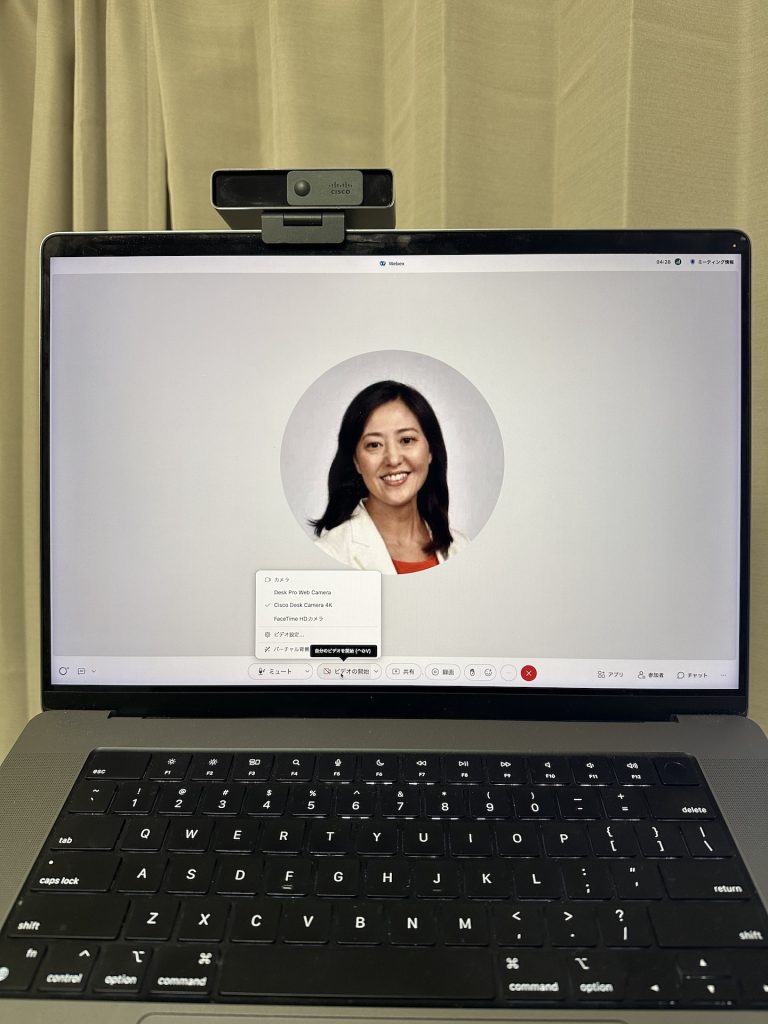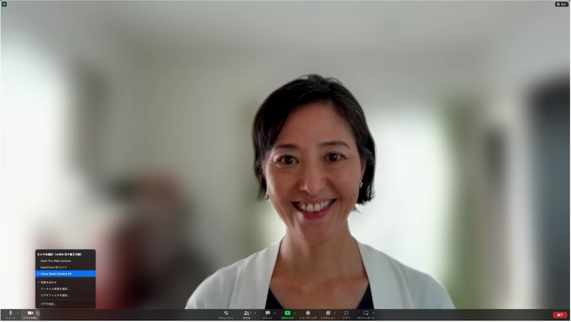 右の画像はZoom会議で Cisco Desk Cameraを利用したもの。外付けカメラとして利用できるのでアプリ側の仮想背景などもPCカメラと同様に設定が可能。