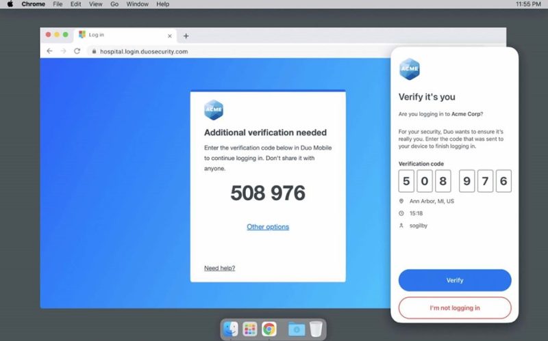 ログインのワークフローには、その他にもセキュリティが組み込まれており、ブラウザのセッションとアプリケーションへのアクセスに使用されているデバイスとの紐づけが行われます。この仕組みにより、MFA プロンプト爆撃などの手口を使ったフィッシング攻撃が軽減されます。Duo は、次の方法でこれを実現しています。