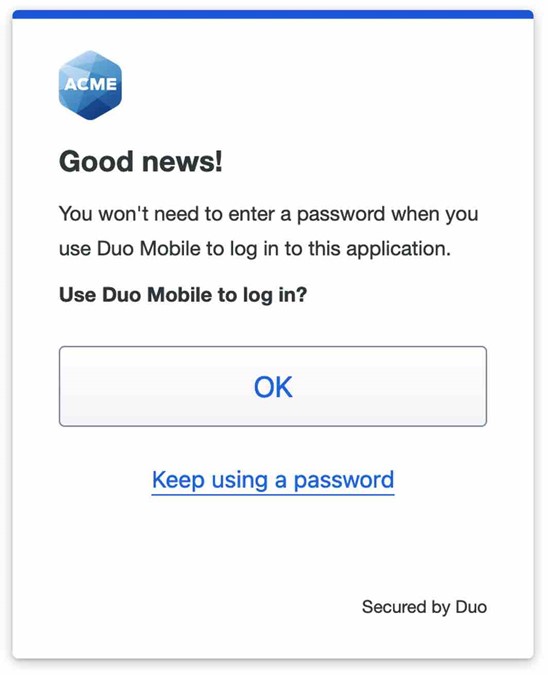 この記事では、より安全な認証方法である Duo Push を使うことで、Duo Mobile 認証アプリでパスワードレス認証を行えるようにする方法をご説明します。