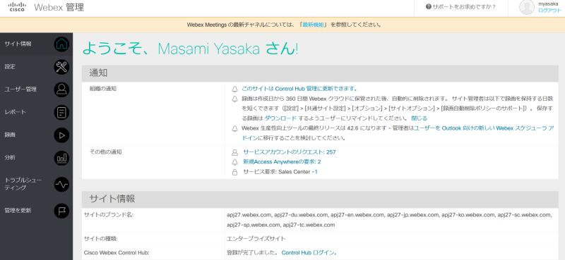 Webex Meetings のユーザー設定はSite Admin管理のポータルで管理されていますので、