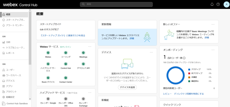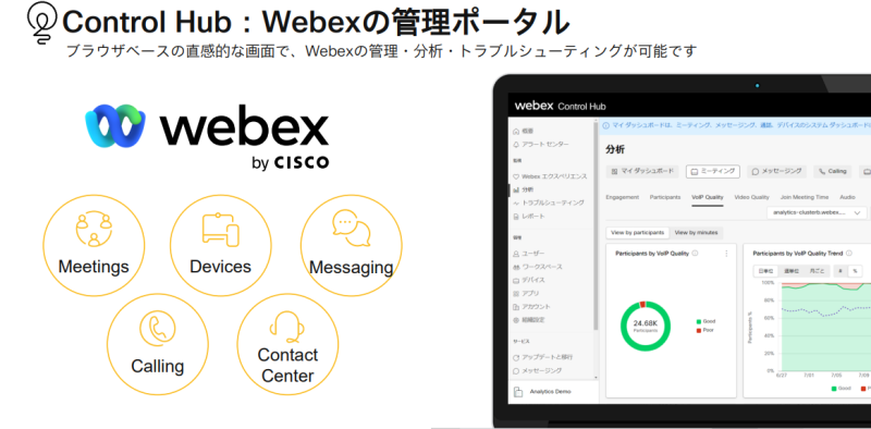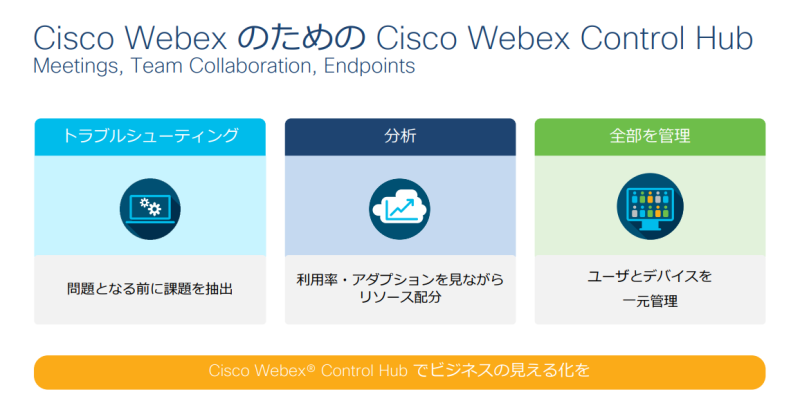 Control Hubに移行する事によりユーザーやデバイスの設定、トラブルシューティング、分析等全てのWebexサービスをまとめてControl Hubで管理できます。