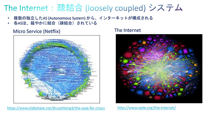 インターネットは、複数の独立したシステム( Autonomous System )から混成されている、疎結合( loosely coupled )システムです。これはまさに、クラウドネイティブな「マイクロサービス」と同じようなアーキテクチャです。このような、独立したコンポーネントが疎結合的にで緩やかに結合されているステムの特徴は、システム同士の相互作用が重要であり、かつスコープを定めにくいということです。何がどのように繋がってくるのか、システムの設計時に前以て予測することはできません。そして CI/CD という言葉のとおり、常に変化し、進化して行きます。