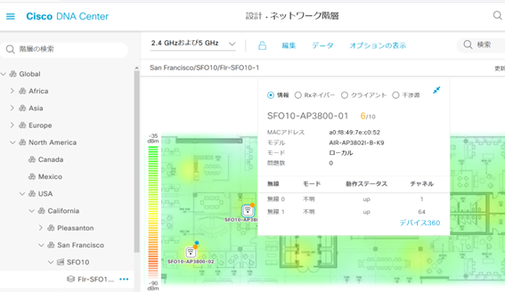 実際に Cisco DNA Center でも、無線 LAN に接続している端末の位置情報を計測し、Cisco DNA Center 上で可視化する機能を搭載しています。端末と無線アクセスポイントの距離を電波の強度によって測定することで、正確な位置を把握できる仕組みです。