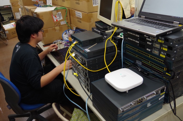 「クリエーションライン杯第3回 ICTトラブルシューティングコンテスト」は、本番の1週間前の3月6日から会場での設営およびネットワークの検証を始めます。前回のブログでは運営チームの業務を紹介しましたが、今回は設営中の現場のようすをお伝えします。 ネットワーク環境の構築 会場入りした運営チームにとって最大の作業となるのが、ネットワークの構築です。通常のシスコ ネットワーキング アカデミーのCCNA Routing & Switchingコースでは、主にCisco 1941 ルータとCisco Catalyst 2960 スイッチを実機教材として使用します。しかし、トラコンのネットワーク環境には、Cisco IP Phone や Cisco UCS といった機材も接続されており、実際の企業のネットワークにより近い構成になっています。 このなかでは、ネットワーク全体を運用するためのコミュニケーションが重要になります。例えば学生のなかには、サーバが得意なものもいれば、ネットワークが得意なものもいます。これらの学生たちが正しくコミュニケーションできなければ、会場のネットワークが止まってしまう可能性もあります。11月から培ったコミュニケーション能力が、実地で試されます。 問題への回答の検証 トラコンで出題される問題は、Web パフォーマンス問題やネットワーク疎通問題、DNS セキュリティ問題など、多岐にわたります。会場では、これらの問題に対して、きちんと想定通りの回答が導き出せるようになっていることを検証します。つまり、問題が解決可能なだけではなく、「他の回答にならない」ことも検証しなければなりません。そのために学生たちは、授業の合間をぬって会場に集まり、日々検証作業を続けていました。 イベント運営に伴う作業 ネットワーク構築のような技術的な作業だけが運営チームの仕事ではありません。当日の段取りについても、細かい部分を詰めていかなければなりません。 昼食や終了時間だけでなく、電源の確保など、詳細なタイムスケジュールを作り、会場となる学校と交渉しながら、当日の段取りを決めていきます。 こうした実際のトラブルを克服しながら、運営スタッフの学生は、当日までに問題策定と会場ネットワークを構築していました。 準備中の運営スタッフのようすを
