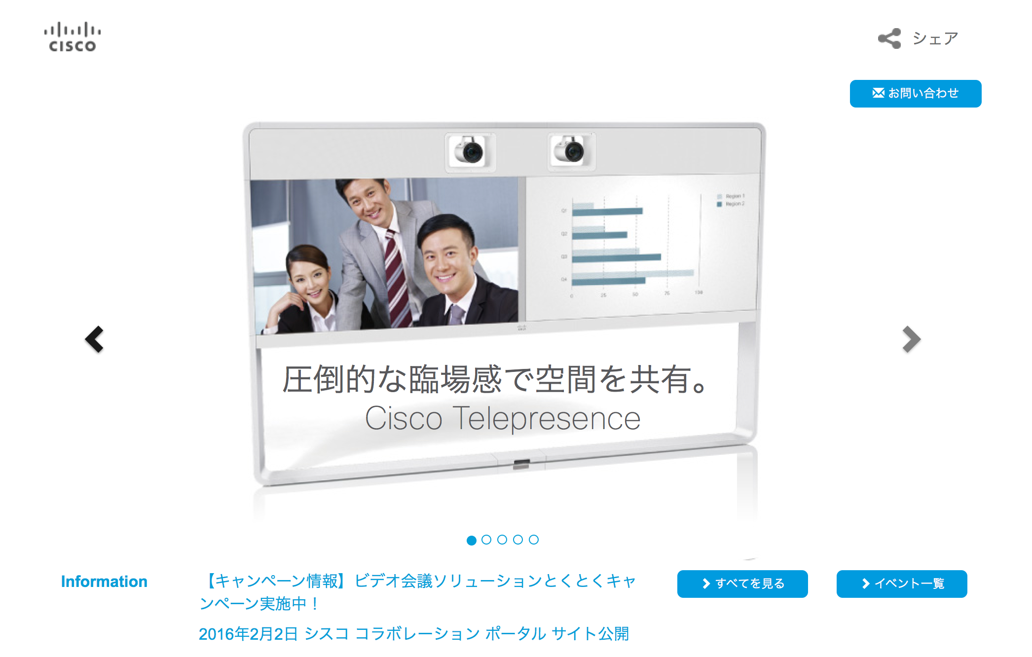 コラボレーションシスココラボレーション製品による新しい働き方をご紹介する「コラボレーション ポータル サイト」が登場しましたのでご紹介します。シスココラボ製品をご検討中のお客様、現在ご利用中のお客様のみならず、シスコのパートナー様、シスコ社員にも役立つサイトです。 まず、会議・電話・コンタクトセンターの分野ごとの製品カテゴリから、かんたんに必要な情報を得ることができます。事前の製品知識がなくても、シスコ製品のこれが役立つ、というのを数回のクリックで知ることができます。 シスコが目指すコラボレーションスタイルを知ることと同時に、すでにご利用されている数多くのお客様のコラボレーション活用事例を閲覧することができます。 『ビジネス大変革時代に即応するこれからの組織と人財』『メール文化からの脱却!デジタル ビジネス時代に勝つチーム ビルディング』『みんながかんたんなビデオ会議製品の選び方』の 3 つをスペシャルコンテンツのセクションでご紹介しています。 さらに新しい働き方、従来環境との違いをビデオでわかりやすくお伝えしています。 新しいコラボレーションを様々な角度からお伝えするために作成したポータルサイトです。今の働き方から新しい働き方にどう進化できるのか、このサイトを閲覧しながら想像してみてください。