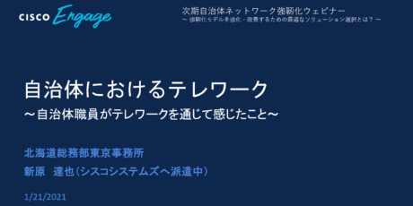 We are Cisco2020年4月より北海道庁からシスコに派遣されている新原です。今回は、1月21日に開催された「次期自治体ネットワーク強靭化ウェビナー」で私が担当したセッション「自治体におけるテレワーク」のうち、テレワーク活用例について概要をお伝えします。