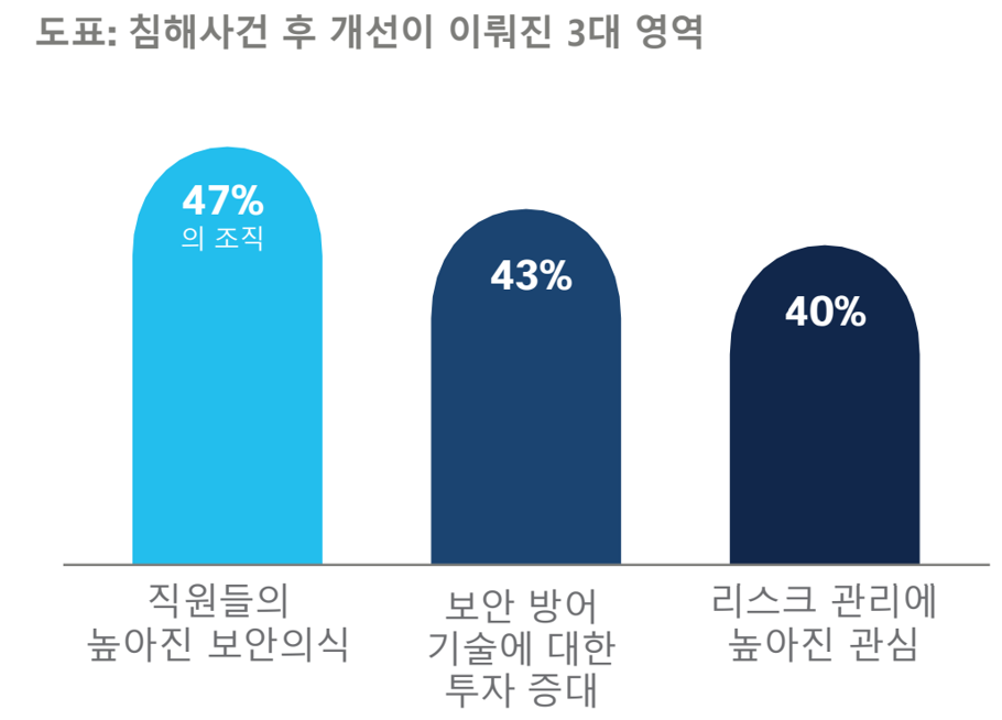 두 번째로 높은 43%의 응답률을 보인것은 ‘보안 방어 기술에 대한 투자 증대’입니다. 보안 벤더들이 좋아할 만한 통계네요. 결국 사고가 한번 발생해야 투자에 적극적으로 나서게 된다는 것인데 앞으로 이 항목은 개선되는 항목에서 비중이 줄어들었으면 좋겠습니다. 사고가 발생하기 전에 미리 예방 차원에서 투자를 할 수 있는 분위기 조성이 더 좋을 테니까요.