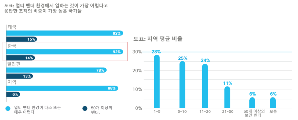 이렇게 어려운 보안 환경속에서 한국의 CISO들은 어떻게 대응하고 있을까요? 왼쪽의 차트를 먼저 보시죠. 이번 조사에 응한 기업들 중 54%는 보안 환경 구축을 위해 10개 이상의 보안 벤더 솔루션을 이용하고 있다고 응답했습니다. 이는 아태지역에서 가장 높은 비율을 보인 국가 중 하나입니다.