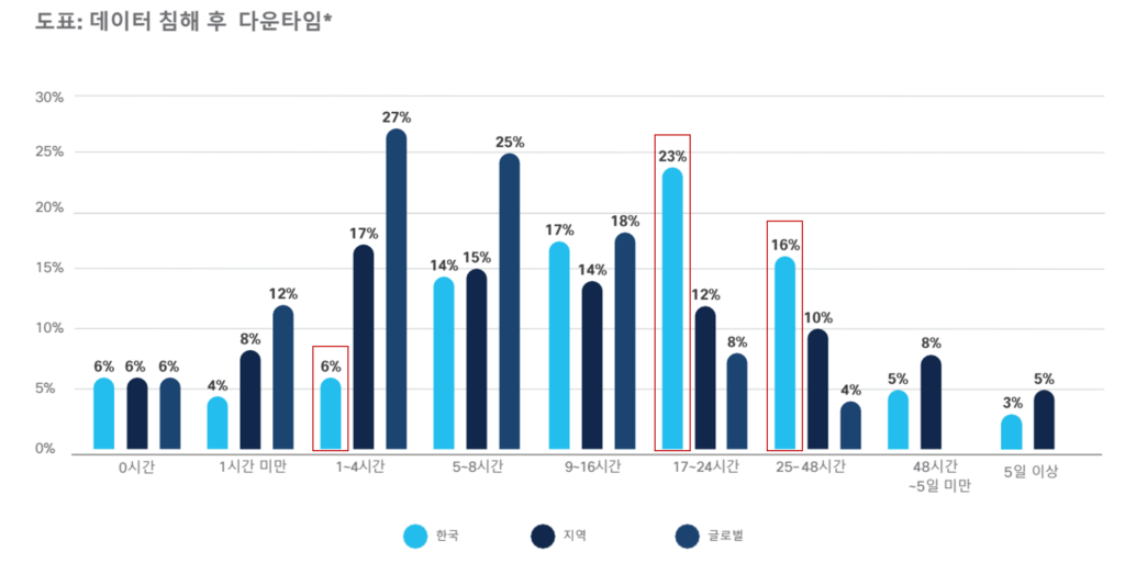 그나마 다행인 것은 48시간 이후까지 해결하지 못하는 경우는 아태지역 평균보다 낮다는 것입니다. 아시아 태평양을 제외한 글로벌 평균의 수치는 0%인 것이 인상적이네요. 그만큼 한국과 아시아 국가들이 보안 사고 발생 후 해결하는 데에 더 많은 어려움을 겪고 있다고 해석할 수 있겠습니다. 이는 앞서 살펴본 보안에 대한 투자가 인색한 부분에 영향을 받은 것이라고 봐도 좋겠지요.